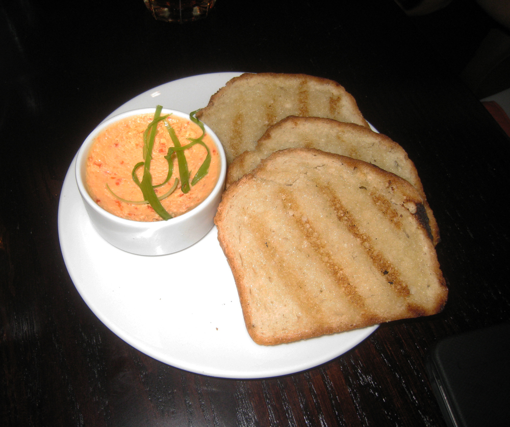 Since we got to Hops N Scotch later in the evening, they only had a “Late Night” food menu available. I have to say that it was a pretty disappointing menu. Some of the items were creative though, like the fried chicken livers or the fried green tomatoes. They even tried to get weird with the grilled cheese by adding an onion jam. Most of my friends and I had just eaten Otto Pizza for dinner (amazing by the way) so we weren’t that hungry, but one friend who hadn’t eaten, tried something on the menu. She ordered the “Home Made Beer Bread.” The description was “Grilled Allagash White beer bread” with “pimento chees [sic].” Sounds great, right?