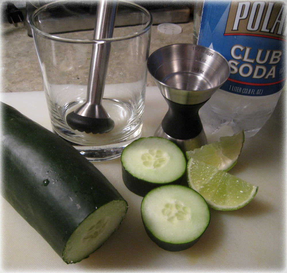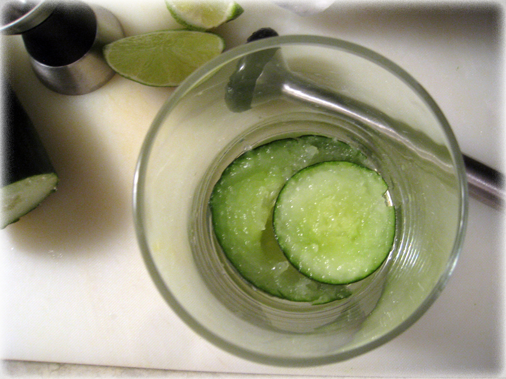 - If you have a muddler, place one of the cucumber pieces into your glass and gently crush it (you’re not trying to pulverize the cucumbers, just rough them up a bit and give them a few bruises).