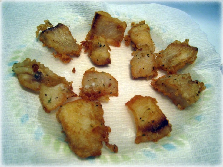 - When the oil is hot and ready (you can tell when the oil sort of shimmers in the pan) place as many pieces of fish as you can in the pan without the pieces touching. If they touch, they will tend to stick together and that can get annoying.