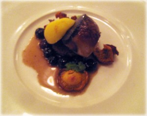 After hearing about the ban on foie gras in California, I thought I would get my foie gras in while I could before MA decides to join in on the silliness (don’t get me wrong, I’m not an advocate for animal cruelty, but foie gras is hardly the biggest concern on my list). The dish came out and the presentation was very well put together. The foie gras balanced on top of a patty-like bed of seared duck confit. Next to the foie gras was a kind of doughy corn cake that was more about texture than taste and provided some starch to the course. The plate had a few chanterelle mushrooms and balsamic soaked blueberries scattered about as well.