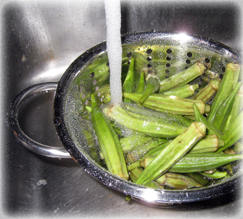 - Wash the okra thoroughly (sometimes there is dirt on them) in a colander or a bowl and then drain the water.