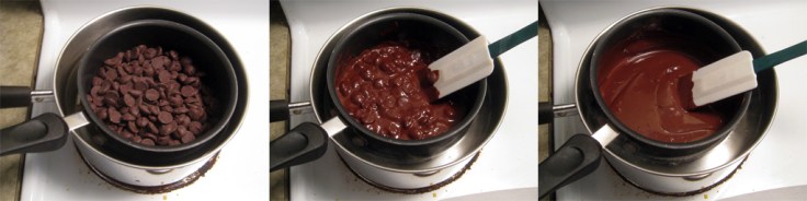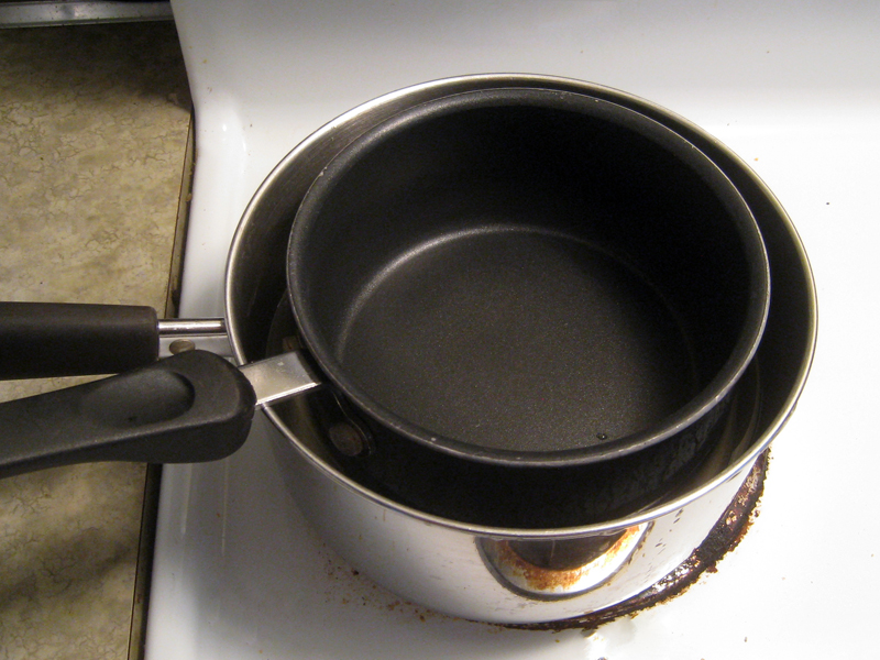 1. Fill a medium sauce pan half way with water and place on medium heat. Then place a small sauce pan inside the medium sauce pan.  If you have double-boiler style pots then just use those. This is extremely important because you don’t want to put the pot with the chocolate directly on the stove and risk burning the chocolate.  The double boiler method helps you manage the heat.