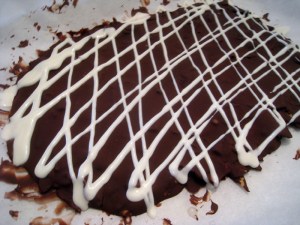 9. Once the chocolate has hardened, drizzle two tablespoons of vanilla glaze (I just bought some rather than made it myself) in a kind of criss-crossed pattern or any other pattern you would like.  Then cool the glaze in the fridge or the freezer for another 15 minutes or so.