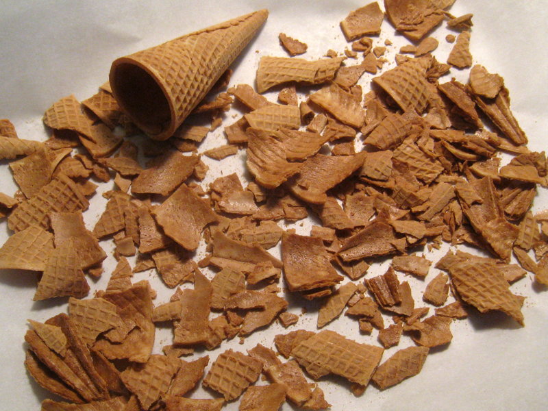 4. Crumble six sugar cones into various sizes (but all flat pieces) onto the parchment paper and keep them together, but one layer.