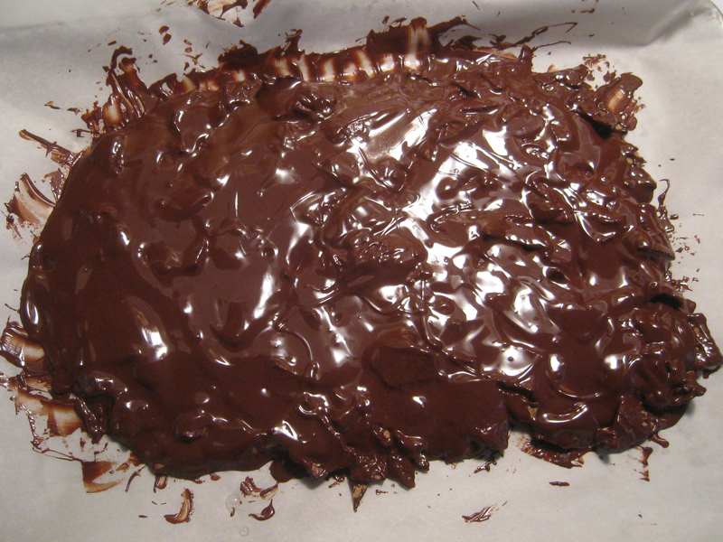 The idea came to me when I saw a recipe for peppermint bark that was also really easy.  In that recipe, the author (apologies to this person whom I forgot) didn’t get overly fancy with peppermint extracts or whatever.  She just crushed up some candy canes and sprinkled them over a thin layer of melted chocolate and York Peppermint patties. Brilliant in my opinion.  The recipe below for my own chocolate bark is even easier than that and you can make it really quickly.