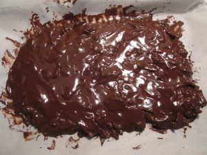 8. Next, place the whole baking tray with the chocolate and sugar cone mixture in the freezer or the fridge (wherever it will fit).  Let it sit in there for about 20 minutes or so until the chocolate has basically hardened.