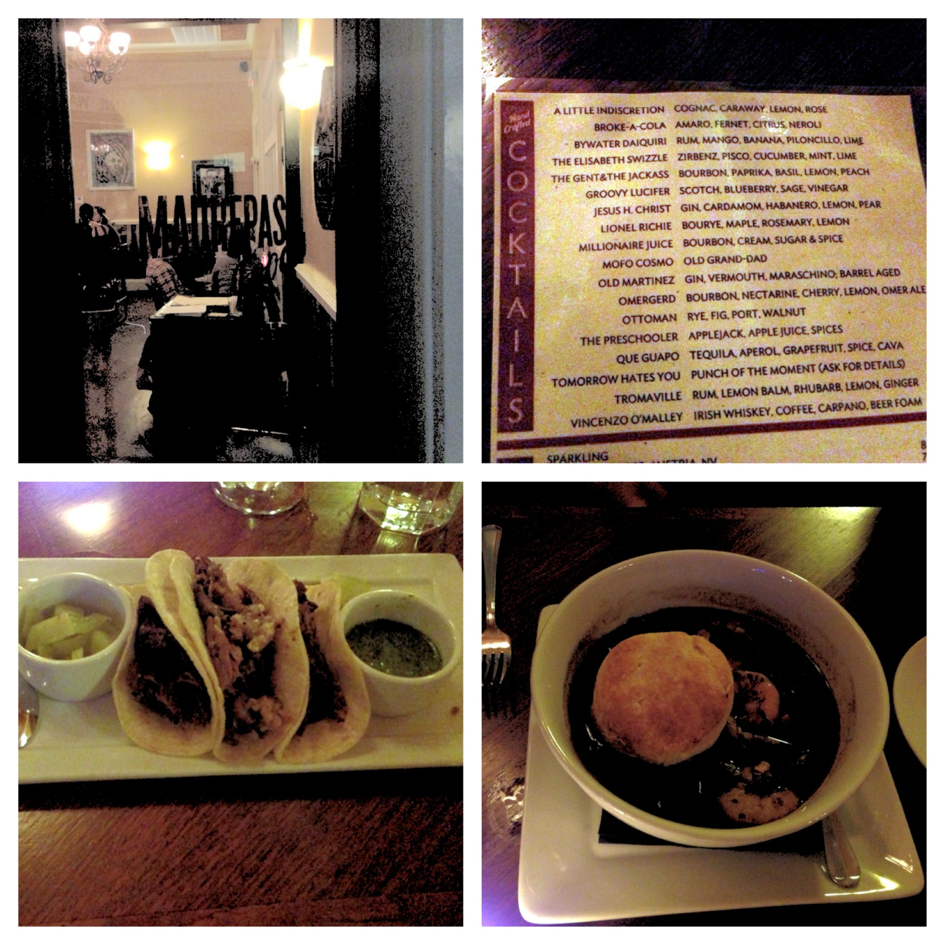 Maurepas – 3200 Burgundy St., New Orleans, LA 70117 – We were absolutely stuffed after Commander’s Palace, but late at night we figured, “What the hell, let’s eat again.” We were in New Orleans after all. I’m on the fence about this place. The interior was modern and had no sound-dampening items like carpet or curtains, which made the place incredibly loud even though the number of people did not match the volume. My friends and I felt like we were shouting the whole time and we could barely hear our waiter explain the fusion-style menu. They also had some really interesting cocktails. I tried the “Gent & The Jackass,” but mostly I just felt like a Jackass because the drink wasn’t very good at all. My friend had the Omergerd, which wasn’t too bad. For dinner, I had the goat meat tacos, which were really well seasoned although the meat was a little dry in some parts. One of my friends had a spicy Hot Pot with Shrimp that had some really interesting Creole spices. It went very well with bread for dipping in the broth. I tasted a piece of the trout entree and I was shocked by how un-fresh it was. I would pass on this entirely. Overall, a solid meal that wasn’t too expensive, but nowhere near the best New Orleans has to offer.