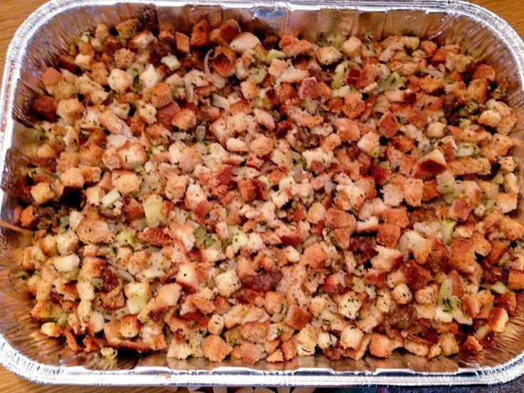 13. Lay the stuffing into a large baking dish (or two dishes depending on how large or small the dishes are)