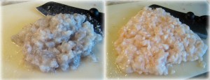 6. Dice the shrimp and scallops into small pieces.  You can also use a food processor for this, but be careful not to over-blend, otherwise you won’t have a chunky texture, but more of a paste.