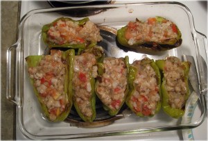 9. Next stuff the peppers with the seafood mixture.  You should be able to use all of the mix spread out over seven or eight peppers.