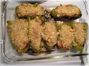 12. Bake the peppers for about 15 to 20 minutes until the stuffing is white and the crackers are golden brown (in the photo below, I think the tops could have browned a little more, but the seafood was done, so I didn’t want to overcook it.