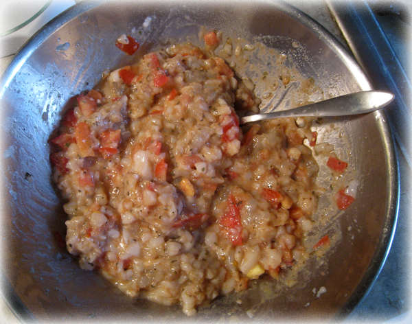 8. Let the ingredients settle and absorb flavors while you carefully cut the peppers down one side and open them so that the stuffing can go in easily.  They will kind of flop about, but when you stuff them you will wrap the sides up around the seafood.