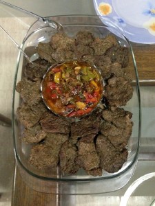 I’m not exactly sure how this beef was cooked. It could have been stewed or fried or seared and baked. All I know is that it tasted really good and that it might have had a touch of allspice in it. The bowl in the middle was a sweet Ethiopian salsa.