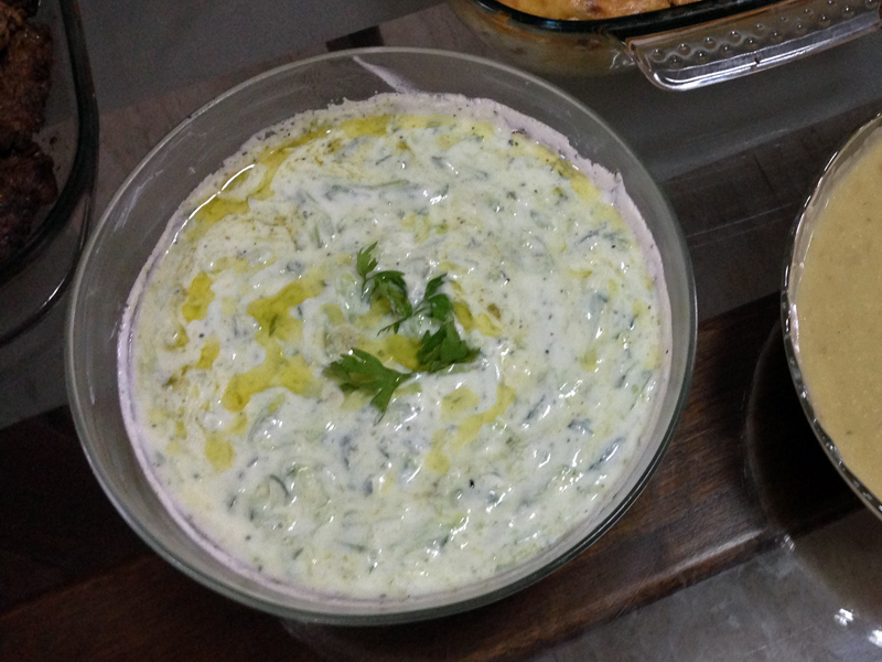 At first I thought this was a sauce or a dip, but my family kept calling it a yogurt salad. It’s made with yogurt (obviously) and had some herbs in it and maybe some diced cucumber. I’m not really sure though.