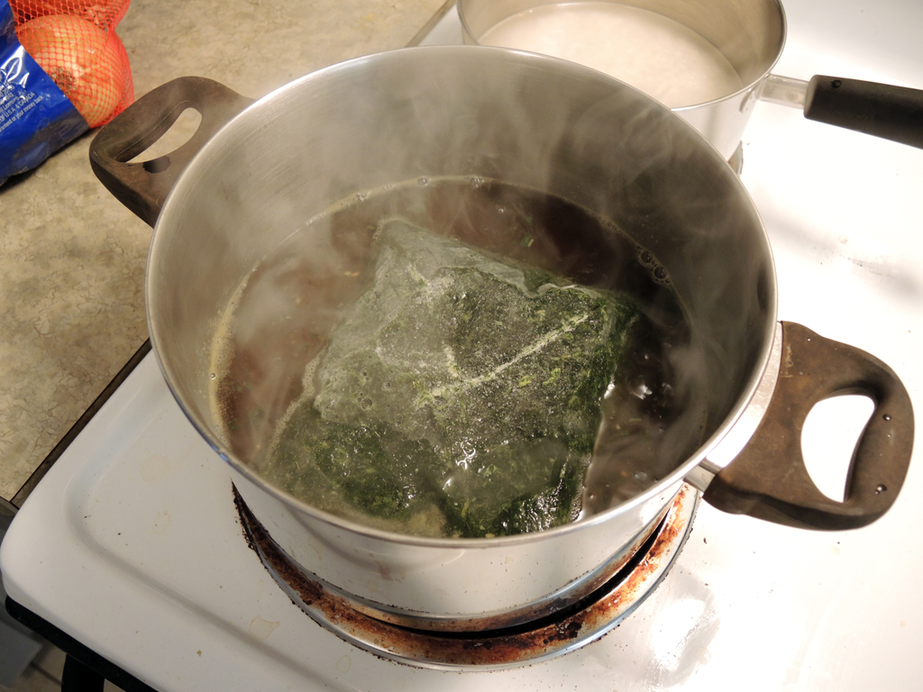 3. Carefully drop each package of frozen molokhia into the boiling broth. Home Is A Kitchen - Frozen Molokhia Added to Broth