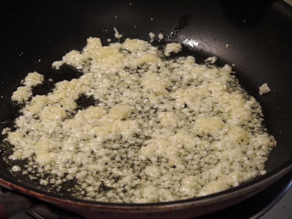 11. Add in 6 crushed cloves of garlic (8 if you really like it garlicky) and saute while stirring frequently until golden brown. Be careful not to burn the garlic! At this point add in the pinch of crushed black pepper to the garlic and saute together. Home Is A Kitchen - Sauteeing Garlic for Molokhia