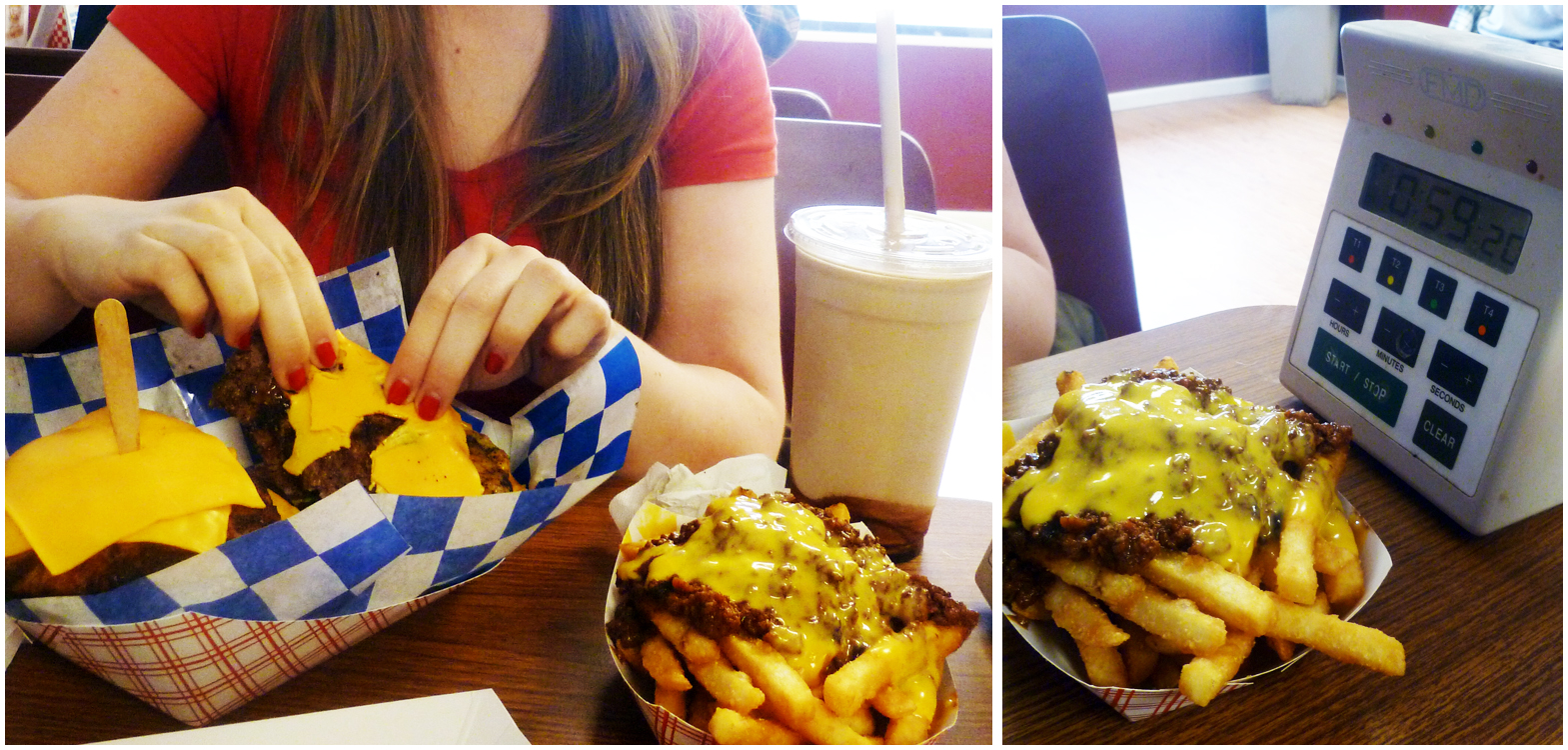 As confident as I was when I began the challenge, I began to slow down around halfway through. I ate three of the patties, then devoured the fries. I took small sips of the milkshake, figuring I would gulp it down at the end. I didn’t know how well the milkshake and burgers would mix. Finally, I was down to 10 minutes, and I knew I couldn’t finish it. I also knew if I pursued the challenge any further, I was going to be sick (definitely not something I wanted to push). I finished everything but one 8 oz. patty and 1/4 of the milkshake. The burger was extremely dense, and even the aid of extra tomato slices didn’t help. So close, but yet so far. The timer finally went off, and I walked out of the restaurant a doubled over failure, vowing never to attempt another challenge again.