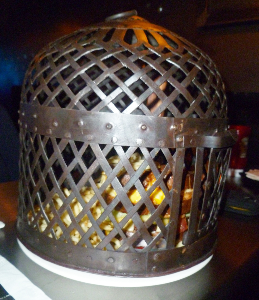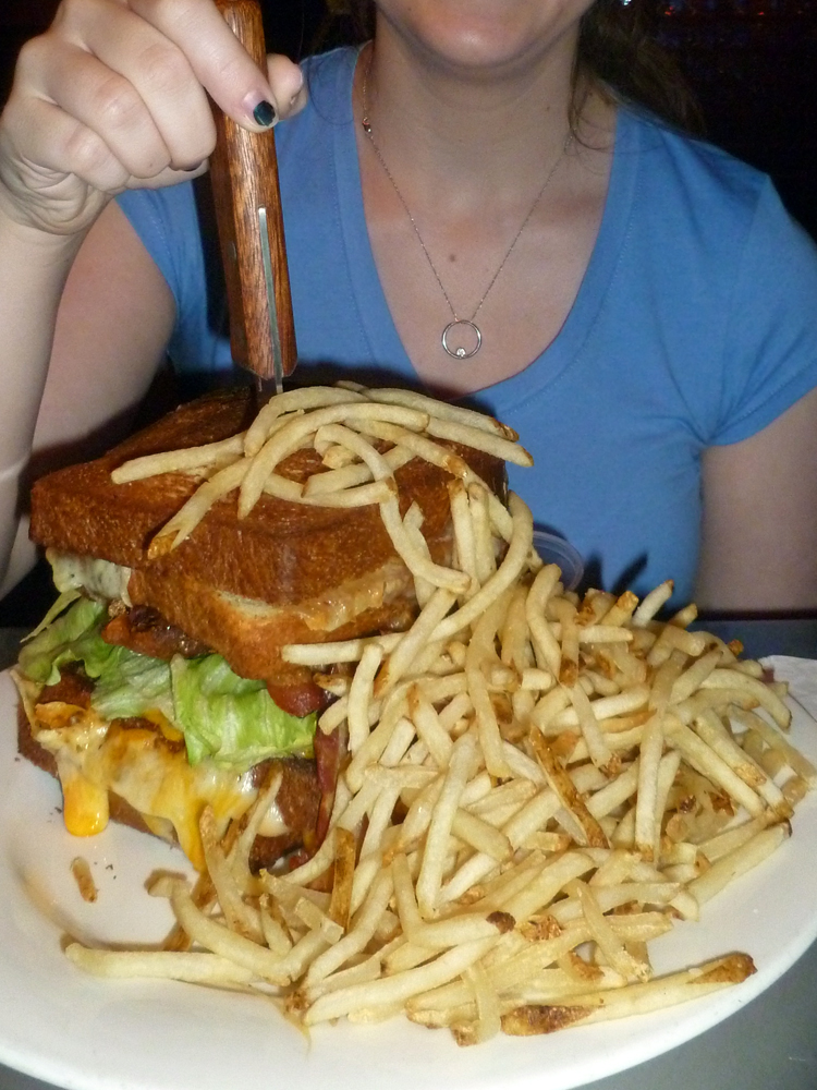 The meal is served in a cage. Yes, you read correctly- a CAGE! Once unleashed, you are staring at “A half-pound cheddar, pepper jack & swiss cheeseburger, with 3 strips of bacon, lettuce, tomato, mayo and fried pickles.” It’s captured between two grilled cheese sandwiches made with thick-cut brioche & more cheddar, pepper jack & swiss cheese. It’s also served with a pile of fries. The handle of a large knife protrudes from the massive sandwich.
