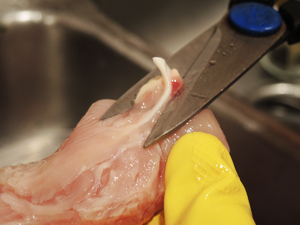 2. Using kitchen shears or a sharp knife, cut off the little piece of cartilage on the underside of the larger end of the chicken tender. You don’t absolutely have to do this, but sometimes this little piece of cartilage can toughen up and get chewy when cooked. Cutting Chicken Tenderloing Cartilage
