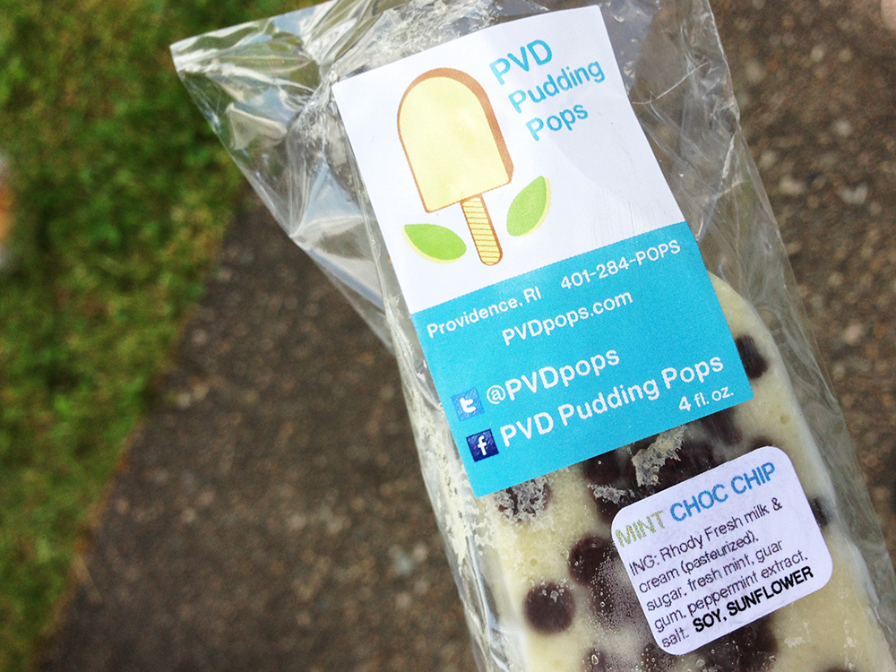 PVD Pops - Mint Chocolate Chip IngredientsOne of the first things I noticed about the PVD Pop aside from the refreshingly cold frost was the ingredients list. PVD Pops proudly uses locally sourced Rhody Fresh milk and cream. They also try to use other local and seasonal ingredients when possible. PVD Pops is a local business that supports local business, which makes it one of the rising many to subscribe to the “eat local” wave washing across America.