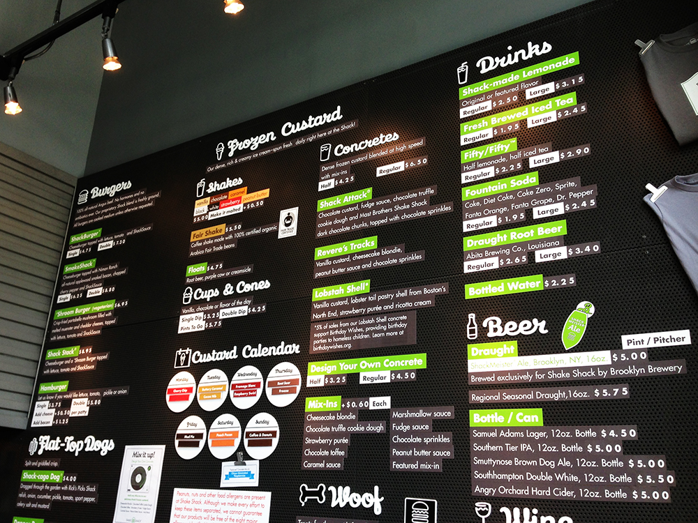 There isn’t a lot to say about the atmosphere of a Shake Shack. From the outside, it looked kind of like a warehouse with inviting signage advertising the treats inside. One prominent point to make about the outside is that there is a patio area where people can eat outdoors when it’s warm out. I guess maybe you could even eat there when it’s cold out because they have those heat generating lanterns outside, but that’s your call.