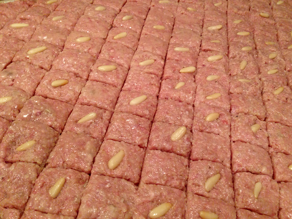 While the meatball version can be very good, I prefer it baked in a tray like the kobeba in this recipe. At first glance, the description seems very basic (i.e. meat stuffed inside more meat and wheat), but I had no idea how arduous this recipe is. This is one of those recipes that isn’t for the lazy or weak willed. It takes time, effort, and patience. While the result is well worth it, after knowing how this is made, I would feel guilty asking someone like my mother (who showed me how to make this recipe) to ever make this for me! Due to the effort involved, I’ve mostly had this dish served at larger gatherings because it’s a great addition to a dinner table seeking to feed a bunch of guests.