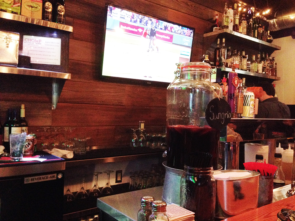 Chomp is a tiny restaurant. It’s not as small as some places, but it’s not nearly large enough to fit the number of people that flood into the restaurant on weekend nights. That’s a good problem for the restaurant and a bad problem for its patrons. Nonetheless, people seem happy to crowd around the small bar area while they wait for a seat at the bar or in the small dining room. There is also outdoor seating, but of course that’s only comfortable on warmer nights.