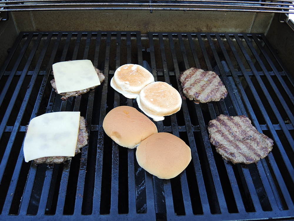 - If you want cheese, add the cheese after the first flip and after two minutes have passed to let it melt for another minute or two. Use this time to grill your hamburger buns as well.