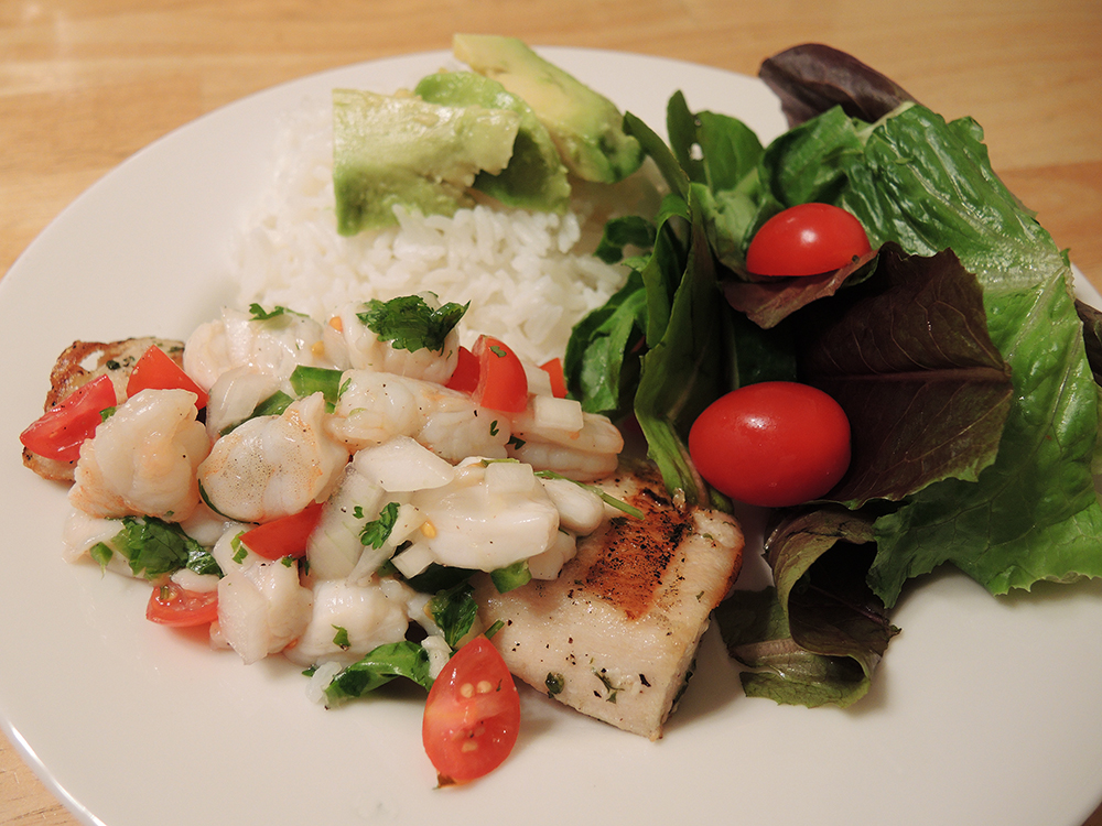 - Try it with avocado slices, or rice, or even as a topper for grilled fish. In the picture below, I did all three and topped some grilled mahi mahi with the ceviche while slicing an avocado over my white rice. You can even just eat the ceviche as it is with tortilla chips!