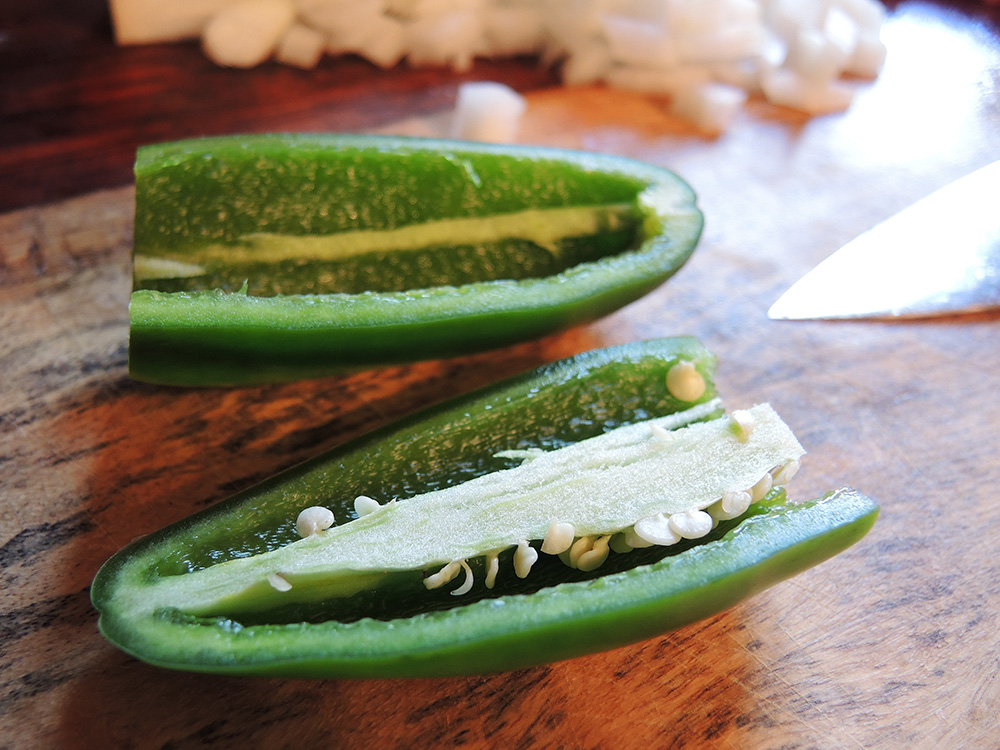 - De-seed a jalapeno (so that it looks like the one on top) and finely dice just the outer green part.