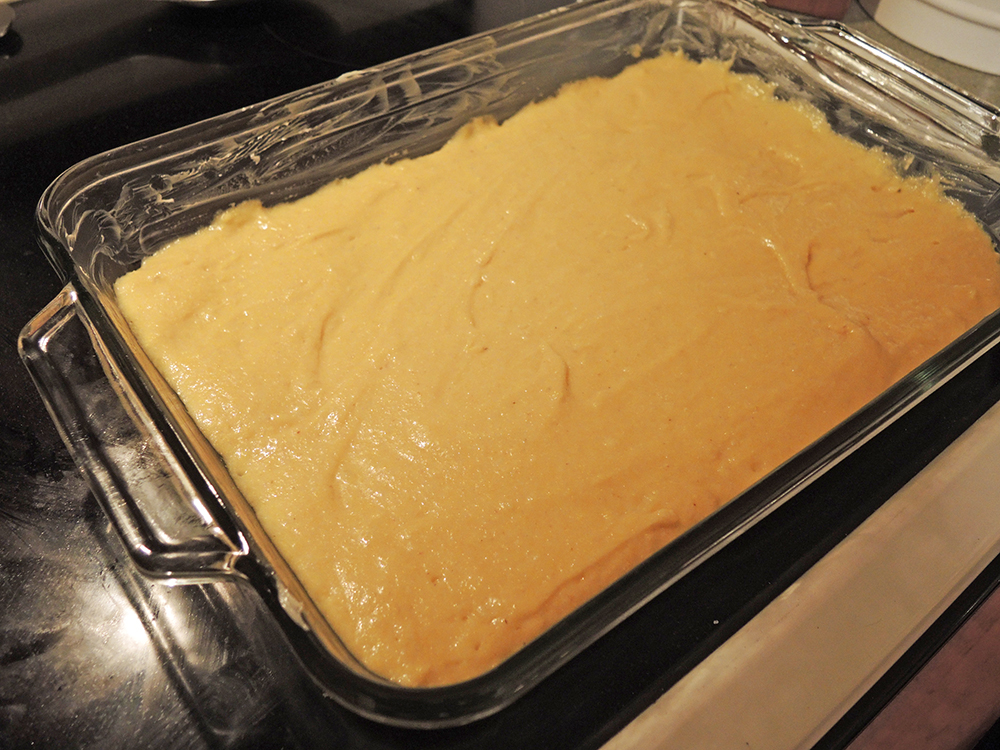 9. Pour the cornbread batter into the dish. Again, you can use an 8 x 8 (for thick pieces) or a 9 x 12 (thinner pieces) or a large cast iron pan. Man Fuel - Food Blog - Cornbread Recipe - 9x12 DishMan Fuel - Food Blog - Cornbread Recipe - 8x8 Baking Dish