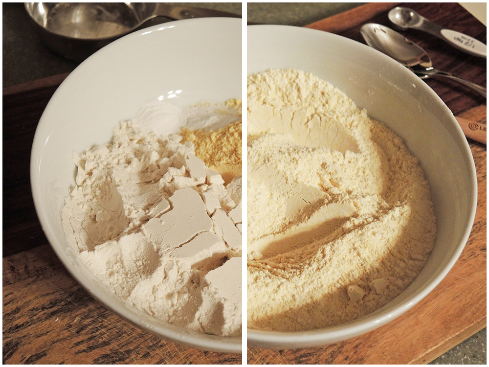 2. Place the 1 cup of cornmeal, 1 cup of flour, 1/2 teaspoon salt, 1/2 teaspoon baking powder, and 1/2 teaspoon baking soda into one mixing bowl. Then, using a fork, mix all of the dry ingredients together. Man Fuel - Food Blog - Cornbread Recipe - Flour and Corn Meal