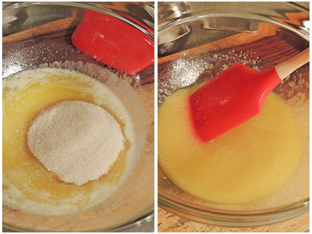 4. Add in a 1/2 cup of sugar to the melted butter and mix thoroughly until well incorporated. Man Fuel - Food Blog - Cornbread Recipe - Sugar and Butter