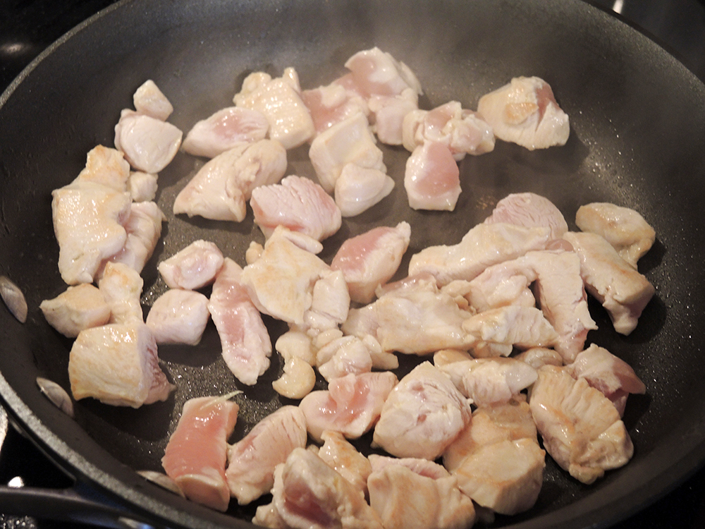 - In a medium to large skillet place a teaspoon of olive oil and bring the heat up to medium-high. Sear the chicken in batches until the sides are golden-brown. You are not trying to cook the chicken, but rather just give the pieces some color. It’s ok if not all of the chicken has hit the pan and still looks a little raw, so don’t overdo it.