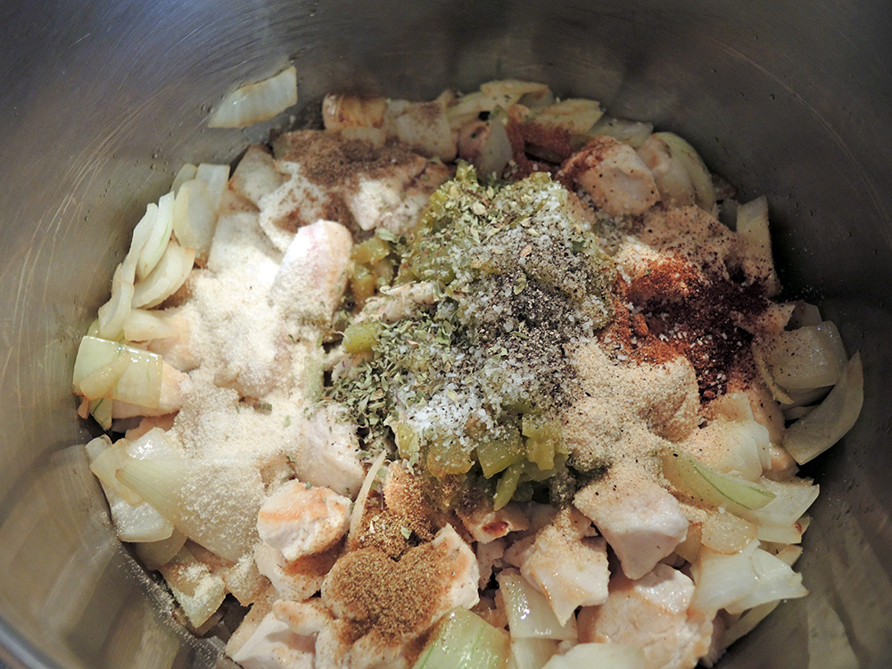 - After a couple of minutes add the green chiles along with all of the spices to the pot and mix all of the ingredients thoroughly.