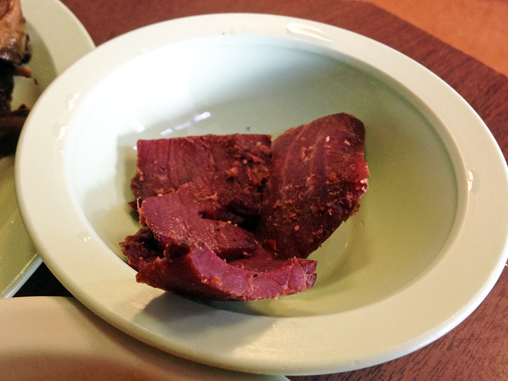The owner described this to us as Hawaiian Beef Jerky. It was thicker than beef jerky, more tender, and really flavorful. It also had fenugreek in it, which gave it a mild basterma flavor (Middle Eastern cured beef).