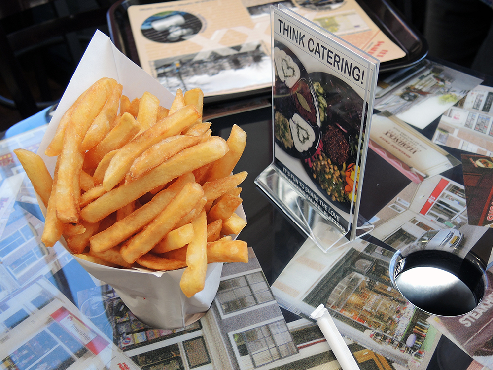 The interior of Amsterdam Falafelshop is bright with a lot of light. The seating is casual with custom-made tables that are designed to hold the paper cones of fries or even a precariously balanced falafel sandwich. The owner, Matt D’Alessio, informed us that the decor and salad bar service style is inspired by Amsterdam itself with the red wall colors acting like an homage to Amsterdam’s infamous “red light district.” Pictures of Amsterdam are on the walls and tables just to give an added impression of the origins behind this Dutch style of falafel service.