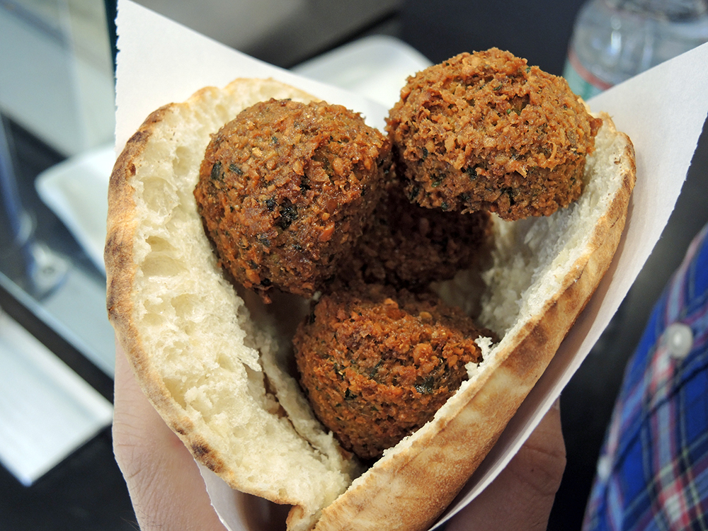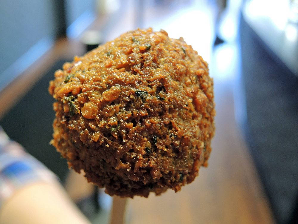 The menu at Amsterdam Falafelshop is remarkably simple. Customers have their choice of a falafel sandwich, a falafel bowl, and frieten (dutch fries). They also serve house-made brownies. While the menu is simple, the restaurant boasts the discovery of the “perfect falafel recipe.” We got our first opportunity to check out their falafel with a quick sample of one piece on a wooden stick like a falafel-pop.