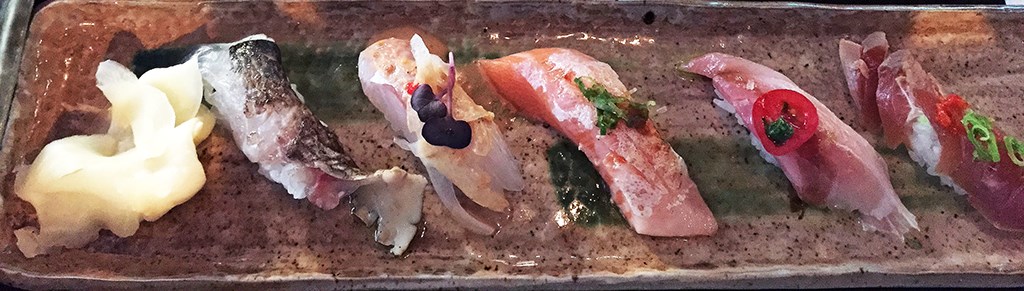 Signature Sampler – I don’t remember all of the fish in the Signature Sampler, but I think from right to left (below) that it came with Maguro (Fatty Tuna), Hamachi (yellow tail), Ikura/Aburi (Salmon Belly), Orata Fresco (Sea Bream), and possibly Saba (Mackerel). The salmon belly in the middle was my second favorite piece of sushi during the entire meal due to its tender, decadent fattiness.