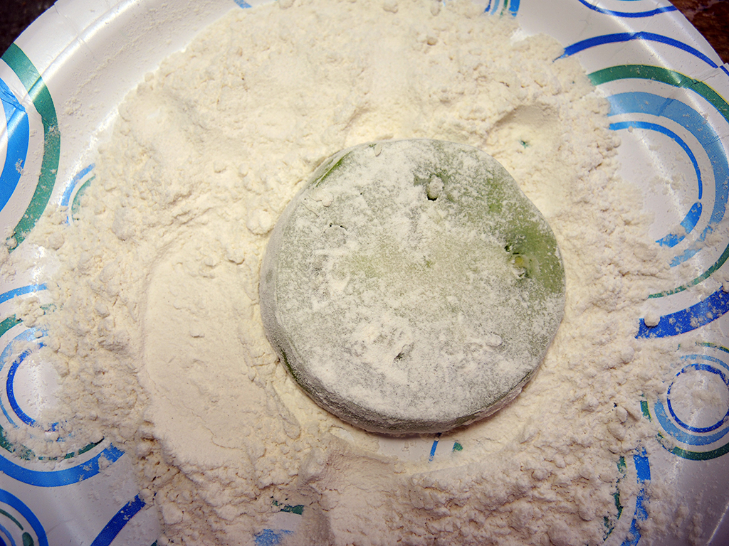- First, dredge a slice of tomato into the flour so that it is well coated. (As you can see in the picture, I used a paper plate for easy cleanup. Don’t tell my wife! She hates it when I use paper plates!).