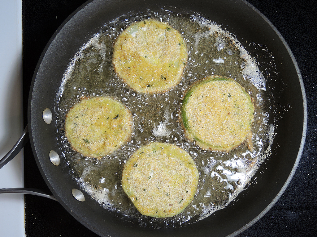 - When all of the tomatoes are coated with the breading, place 1/2 cup of oil in a medium sized frying pan on the stove over medium-high heat. You want the oil to get to about 350 degrees before you start frying. If you’re not sure what the temperature is, then set the stove to medium-high and test the oil periodically. There are a few methods for this. The first is to wait until you see the surface of the oil just start to shimmer. Another method is to dip the handle of a wooden cooking spoon into the oil and if you see bubbles around the spoon handle, then the oil is ready. The last method is to simply drop a very small amount of breading into the oil and wait for it to start bubbling.