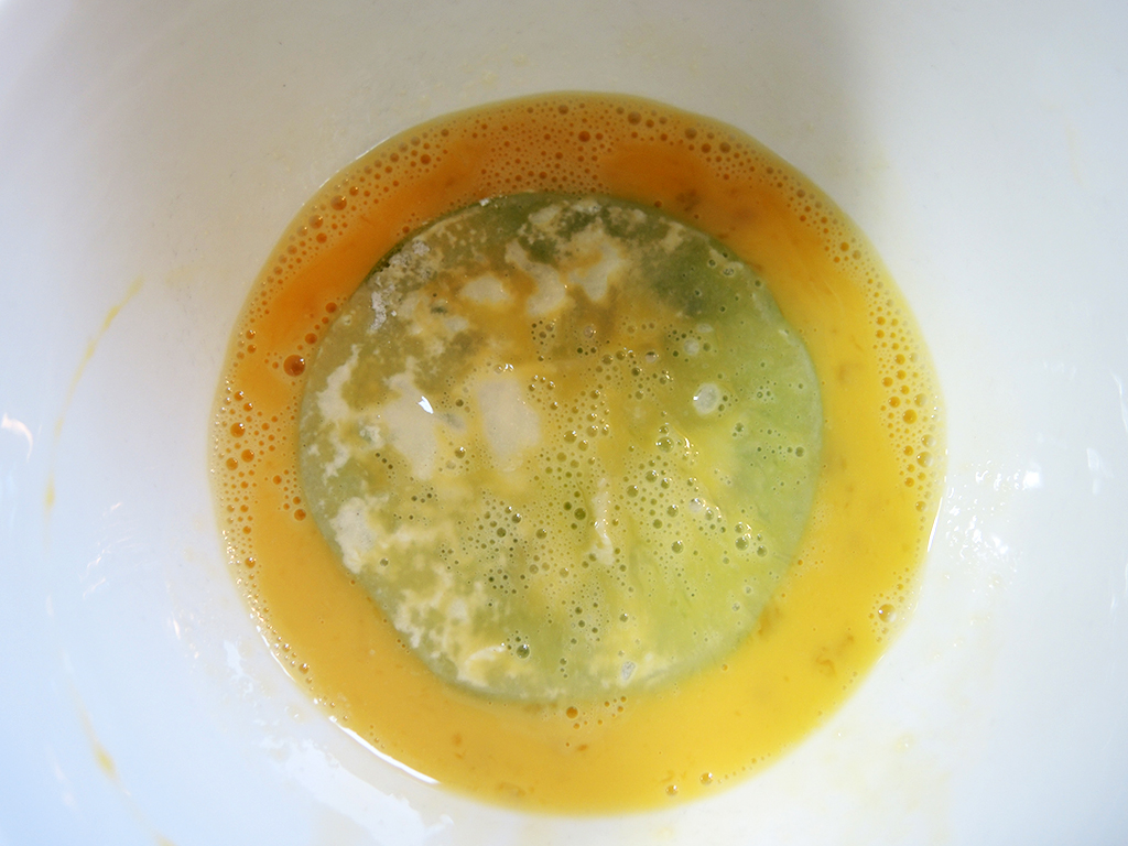 - In a small or medium bowl crack one egg and whisk it with a fork or metal whisk until the yolk and whites are well incorporated.