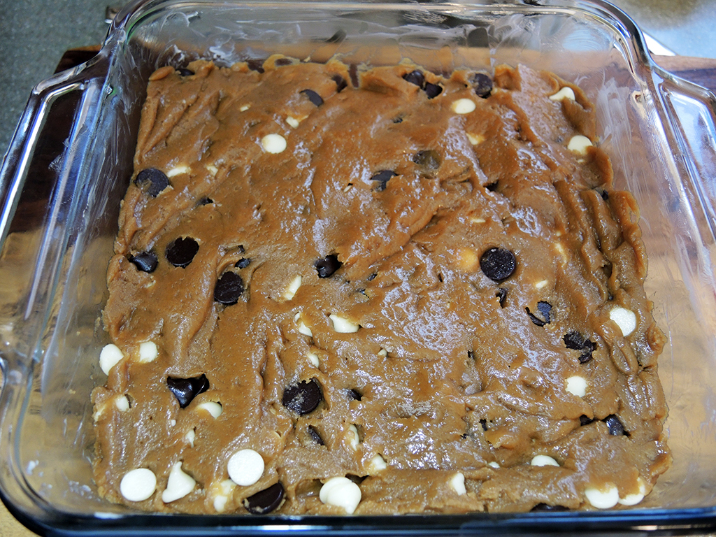 - Bake the blondies in the oven for about 25 minutes. Bake them for a slightly shorter amount of time if you like them under-cooked and gooey. After 25 minutes check the blondies by sticking a toothpick or knife into the center. If it comes out cleanly without any or much batter, then the blondies are done. You may find some melted chips on the toothpick, but that is ok as long as its clean from batter.