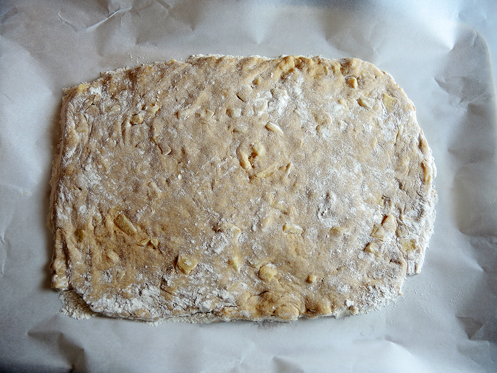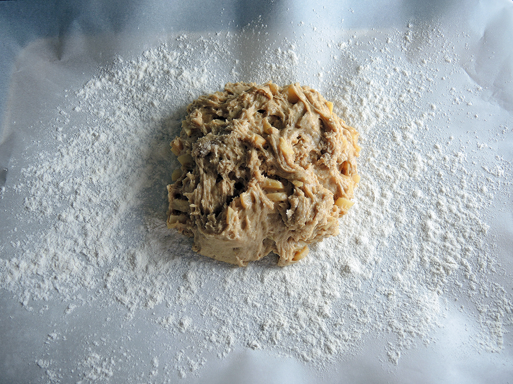 10. On a large baking sheet, spread out a piece of parchment paper and dust it with a light layer of flour. Then pour out the dough onto the baking sheet. Man Fuel Food Blog - Apple Cider Doughnut Batter on Floured Tray