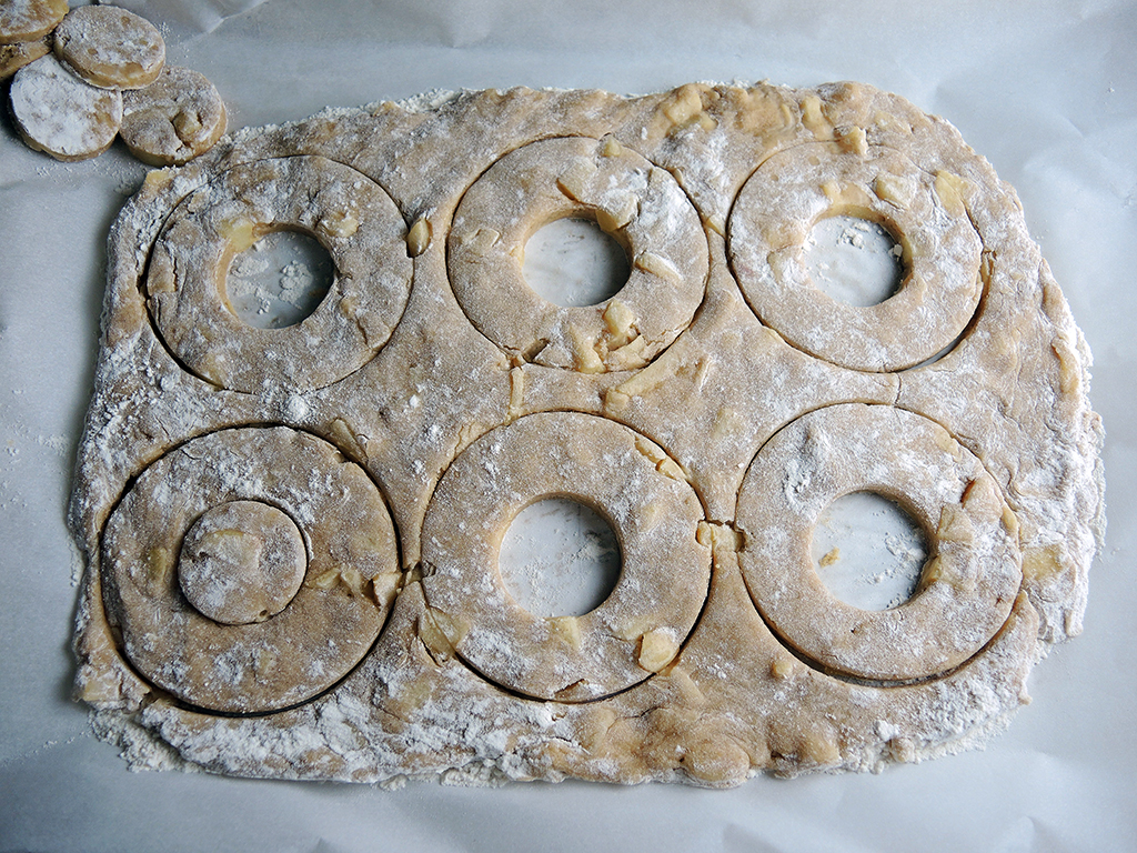 Makes about 8 doughnuts and 8 doughnut holes.