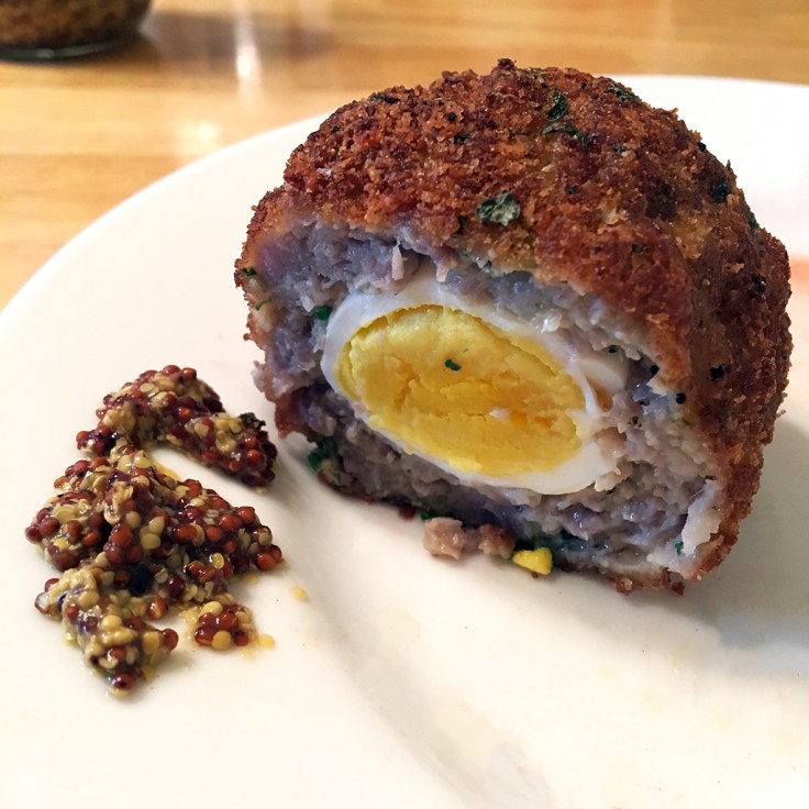 Breaded, lightly fried, and then baked Scotch Eggs with whole grain mustard.