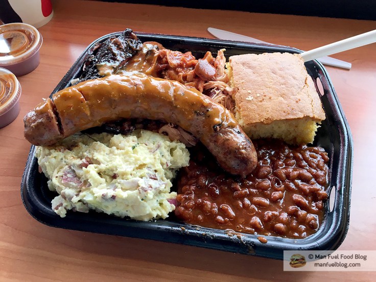 Barbecue Trio Combo (Brisket, Pulled Chicken, Smoked Sausage) – On my platter, I ordered the brisket (the true touchstone by which any barbecue place that serves it must be judged), the pulled chicken, and the smoked sausage. As sides I ordered potato salad, baked beans, and the platter came with cornbread. The sides were all pretty good. The cornbread wasn’t too cakey or too dry, so it struck a nice balance. The baked beans were pretty standard, which is a good thing, but they didn’t “wow” me. The potato salad on the other hand was utterly fantastic. I don’t know why, but it’s possible the potato salad was the second best thing I ate! It was really rich and decadent. The pulled chicken was good with its light smokey flavor, but it wasn’t especially memorable as something I’d order again. The brisket is probably the most tender brisket I’ve ever had, but also the fattiest. The smoke to meat ratio was just right. The leaner pieces tasted great with some of the spicy house barbecue sauce, but some of the brisket pieces were actually just pure fat. Lastly, the smoked sausage was probably my favorite item from Blue Ribbon. The sausage held light smoke, retained a great snap to the casing, and contained a little spicy heat, but it wasn’t overpowering.