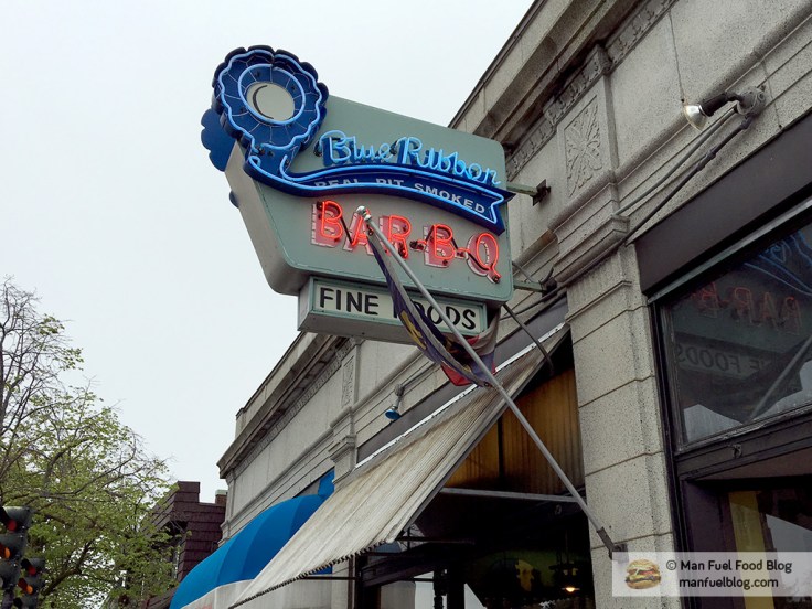 The first thing you’ll notice walking up to Blue Ribbon is it’s wonderful vintage style sign. The shape and neon lights really give off a lot of welcoming character as well as history. The interior has the same style as the sign and the smells of barbecue immediately greet you on entry. It’s also small with a register to order at and very few stools lined up along a counter by the front window for seating. The staff is friendly and they work very quickly to get your food out to you.