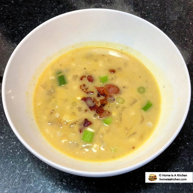 With the corn and potatoes, my wife made a deliciously decadent corn chowder topped with crispy bacon bits and scallions.