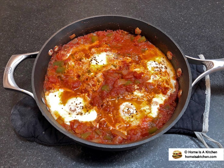 Last, but not least, with the farm fresh eggs I made Shakshuka (a spicy Middle Eastern style tomato sauce featuring fresh vegetables and spices along with eggs poached in the sauce)!